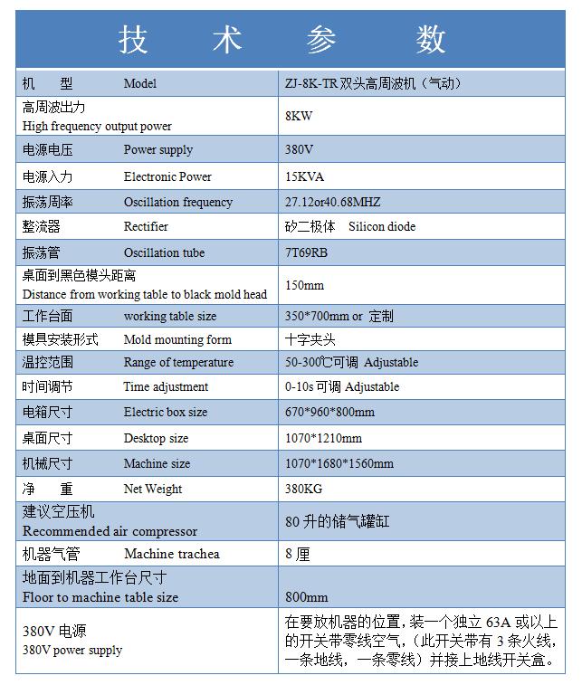 充氣氣嘴雙頭高周波機型號為ZJ-8K-TR,此機裝有防火花保護裝置,對高周波模具及生產產品起到很大的保護作用,是一款雙頭腳踩高周波機機器質量已通過歐盟CE質量出口檢測,ISO9001機器質量檢測;并對客戶的樣板提供免費打板打樣,傳授產品生產整過程工序及提供生產方案。